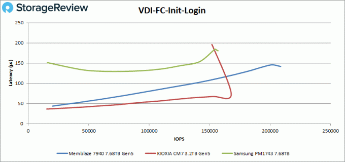 Lors de la connexion initiale VDI FC, le PBlaze7 7940 a atteint 209K IOPS (141,7 µs), tandis que le disque KIOXIA CM7 a légèrement reculé, atteignant un pic de 168K IOPS avec une latence de 73,2 µs avant de connaître un pic de performance significatif à la toute fin du test.