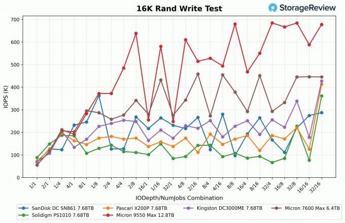 Dans le test de lecture aléatoire 16K, le Micron 7600 MAX (6,4 To) a offert des performances constantes tout au long de la balayage, allant de 17K IOPS à l'extrémité inférieure à environ 350K IOPS en moyenne,et atteignant un sommet proche de 720K IOPS à des profondeurs de file d'attente plus élevéesSa stabilité en a fait l'un des plus prévisibles, conservant une évolution fluide tout au long du parcours, même s'il n'a pas atteint le sommet du classement.