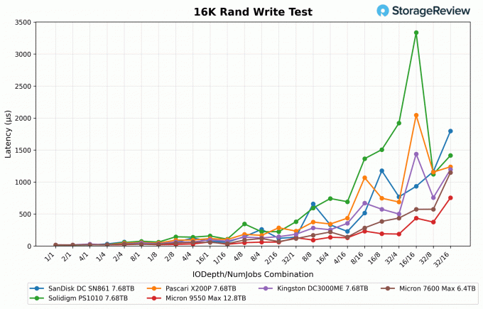 Dans le test de latence d'écriture aléatoire 16K, le Micron 9550 Max (12,8 To) a de nouveau montré la discipline de latence la plus forte, restant entre 0,015 ms et 0,77 ms, avec une moyenne de 0,13 ms sur l'ensemble. Le Micron 7600 Max (6,4 To) était légèrement moins agressif, avec une plage de 0,016 ms à 1,26 ms et une moyenne de 0,21 ms. Cela positionnait le 9550 Max comme le plus efficace sous pression, le 7600 Max conservant un profil compétitif par rapport au reste du groupe.